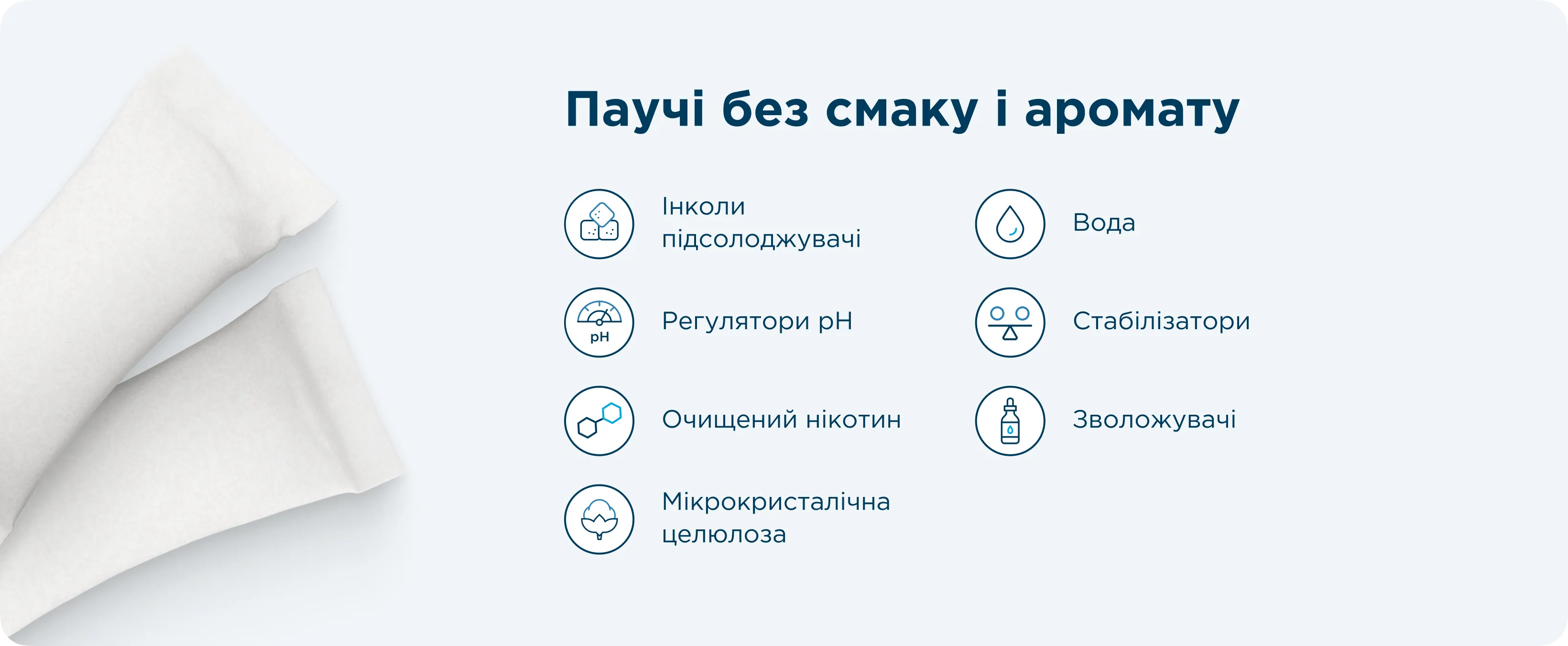 Якщо почитаєш склад цих паучів без смаку, в ньому не знайдеш ароматизаторів (без flavoring agents, essential oils тощо). Їх впізнаєш за написами на пакованні: «Unflavored», «Neutral», «Plain», «Original» або «Natural». В усьому іншому склад звичний для нікотинових подушечок: нікотин, целюлоза рослинного походження, зволожувачі та регулятори pH. Чому склад саме такий, розповідали детальніше у матеріалі.