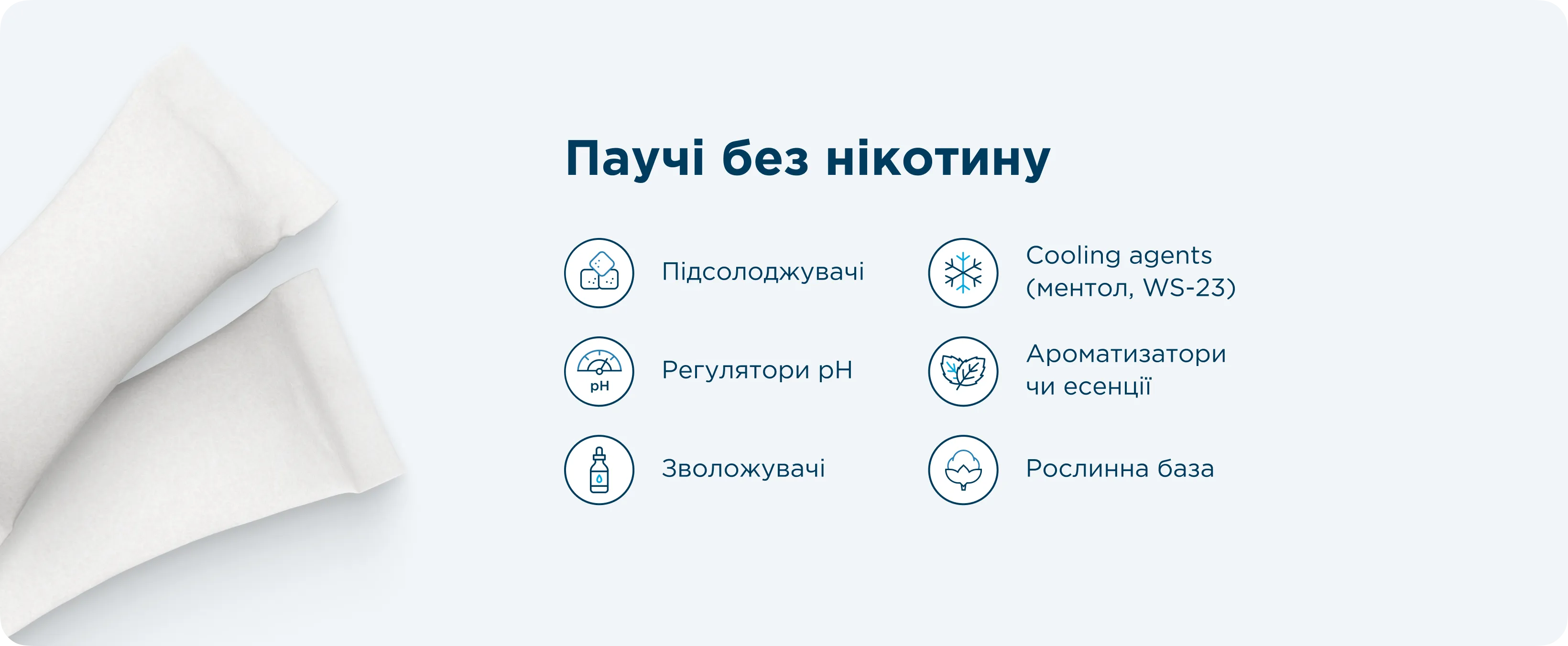 Паучі без нікотину — це подушечки, які закидують під губу, але вони не містять нікотину чи тютюну. Основа складу — рослинні волокна, трави й ароматизатори.
