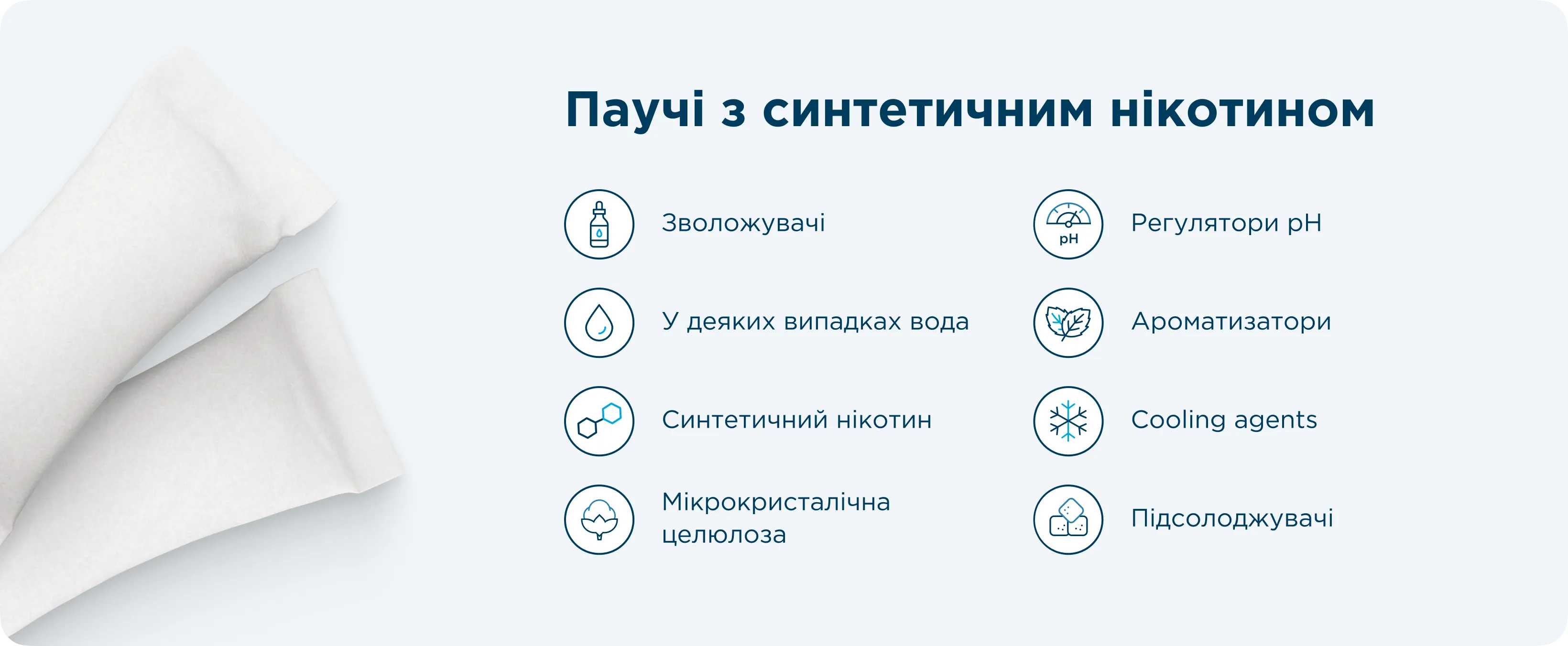 Ще один вид незвичних паучів — «synthetic nicotine pouches», подушечки з нікотином, який отримали не з тютюнового листя, а синтезували його в лабораторних умовах. По суті, це ті ж подушечки, там той же нікотин, але якщо його описувати, нам доведеться додати хімічні формули, а це дещо ускладнить читання.